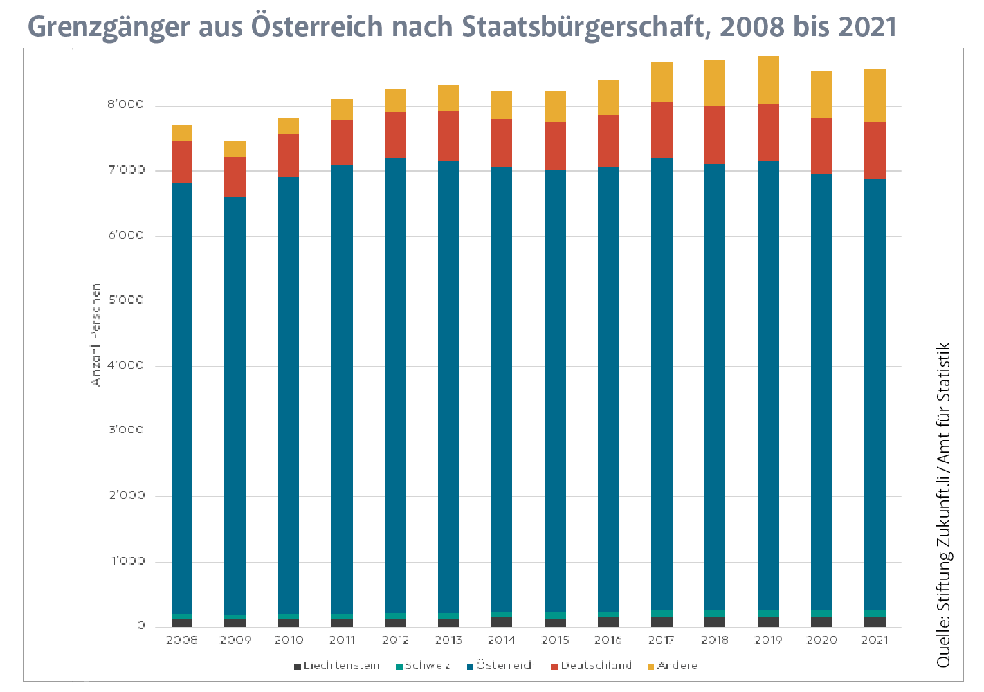 Der Zustrom aus Österreich ist nicht im gleichen Umfang gewachsen. Insgesamt pendelten 2021 aus Österreich rund 8’600 Grenzgänger nach Liechtenstein, 2008 waren es noch 7’700 gewesen. Seit dem Pandemiejahr 2020 ging die Zahl jedoch leicht zurück. Die Zahl der Pendler aus Österreich mit österreichischer Staatsbürgerschaft war 2021 verglichen mit dem Jahr 2008 sogar leicht tiefer, diejenige mit deutscher Staatsangehörigkeit ist hingegen im gleichen Zeitraum um 36 Prozent gestiegen. Die grösste Zuwachsrate verzeichneten mit fast 240 Prozent die Grenzgänger aus Österreich mit «anderer» Staatsangehörigkeit, also nicht aus dem deutschsprachigen Raum.
