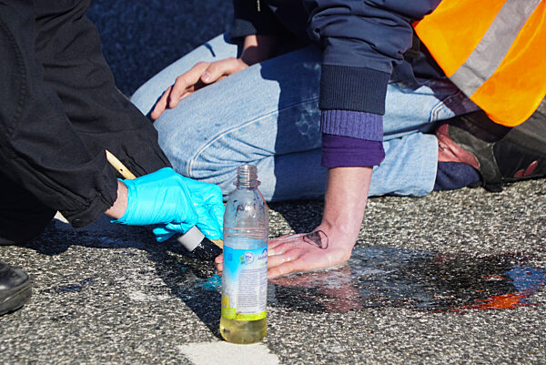 Klima-Kleber-Chaoten, legen durch das ankleben ihrer Hände auf die Strasse auch den Verkehr zum Arlberg lahm.