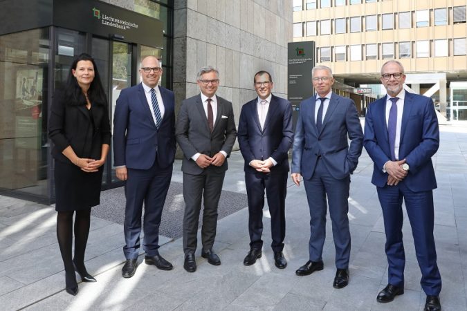 Von links: Natalie Flatz, Mitglied der LLB Geschäftsleitung, Regierungschef Daniel Risch, Magnus Brunner, österreichischer Finanzminister, Christoph Reich, stellvertretender Group CEO der LLB und die Mitglieder der LLB Geschäftsleitung Patrick Fürer und Urs Müller vor dem Hauptsitz der Liechtensteinischen Landesbank.