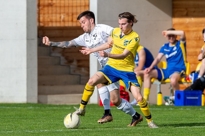 29.4.2023, Derby FC Triesenberg-FC Ruggell, 3-1. im Bild links der Ruggeller Allgäuer gegen den Torschützen Mitrovic (FC Triesenberg). Foto: Jürgen Posch
