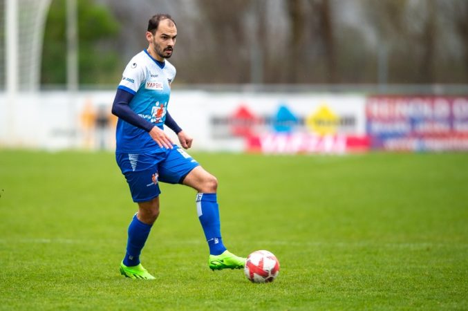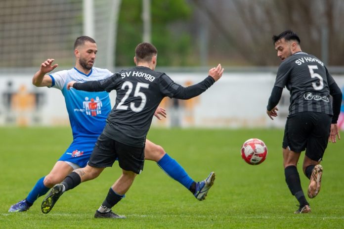 Szene vom Spiel USV - Höngg am 8.4.2023 im Sportpark. Links USV-Innenverteidiger Albin Sadrijaj. Foto: Jürgen Posch