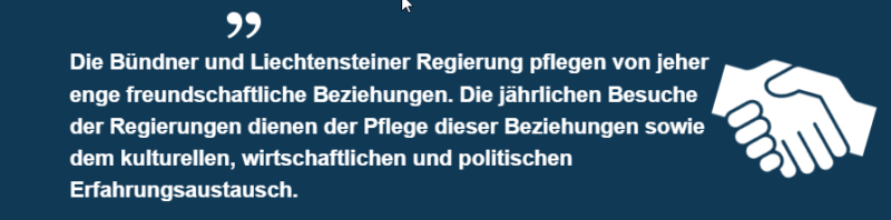 Die Bündner und Liechtensteiner Regierung pflegen von jeher enge freundschaftliche Beziehungen. Zum besonderen Ausdruck kam dies erst kürzlich bei den Feierlichkeiten zum 100‑jährigen Jubiläum des Zollvertrags zwischen der Schweiz und dem Fürstentum Liechtenstein. Die jährlichen Besuche der Regierungen dienen der Pflege dieser Beziehungen sowie dem kulturellen, wirtschaftlichen und politischen Erfahrungsaustausch.