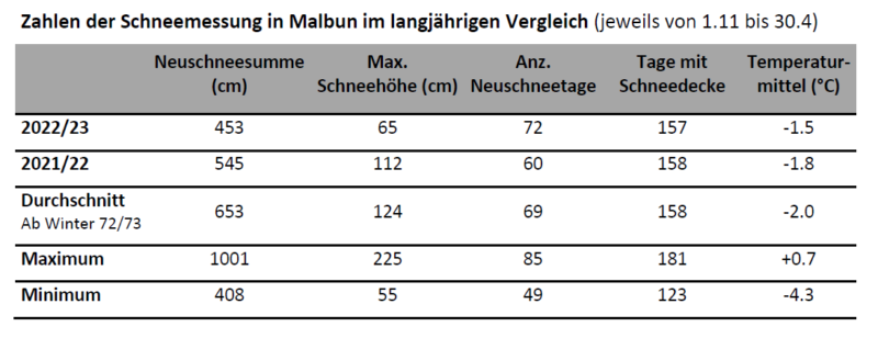 Der vergangene Winter war nicht von viel Schnee gekennzeichnet. Dies zeigen auch die Messdaten des Mess- und Beobachtungsdienstes des Liechtensteinischen Lawinendienstes, welche von Anfang November 2022 bis Ende April 2023 aufgezeichnet wurden. So lag die Neuschneesumme mit 453 cm ganze zwei Meter unter dem langjährigen Durchschnitt von 653 cm. Die maximale Schneehöhe zeigt ein ähnliches Bild mit wenig Schnee, so lag diese mit 65 cm nur leicht über der Hälfte des Durchschnitts von 124 cm. Auch wenn die Anzahl Neuschneetage mit 72 knapp über dem langjährigen Mittel von 69 lag, zeigten die maximale 1- sowie 3-Tagessummen, wie wenig Schnee über den Winter gefallen war. Mit 22 cm (Durchschnitt 44 cm) bzw. 40 cm (Durchschnitt 78 cm) weisen diese beiden Werte sogar einen neuen Negativrekord in der über fünfzigjährigen Messreihe auf. Trotz des wenigen Schnees wurde doch an 157 Tagen eine Schneedecke gemessen, während die Morgentemperaturen mit -1.5 Grad verglichen mit dem Durchschnitt (-2.0 Grad) etwas zu warm waren.