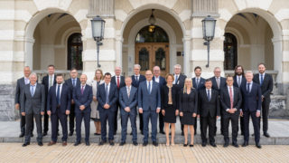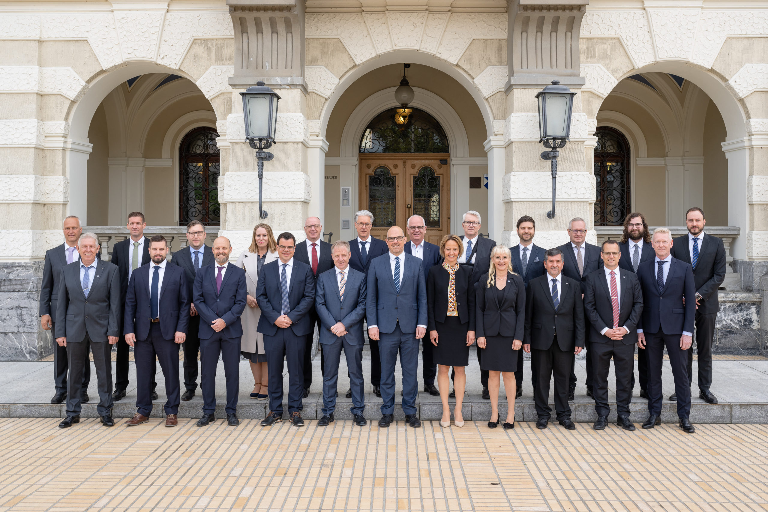 Regierungschef Daniel Risch mit der Bürgermeisterin, Vorsteherin und den Vorstehern mit der Stellvertreterin und den Stellvertretern beim Gruppenfoto vor dem Regierungsgebäude.
