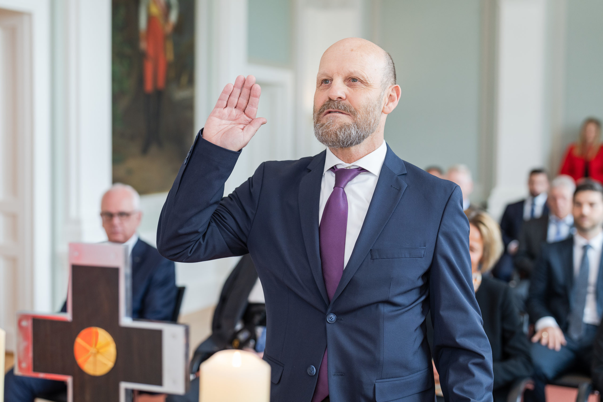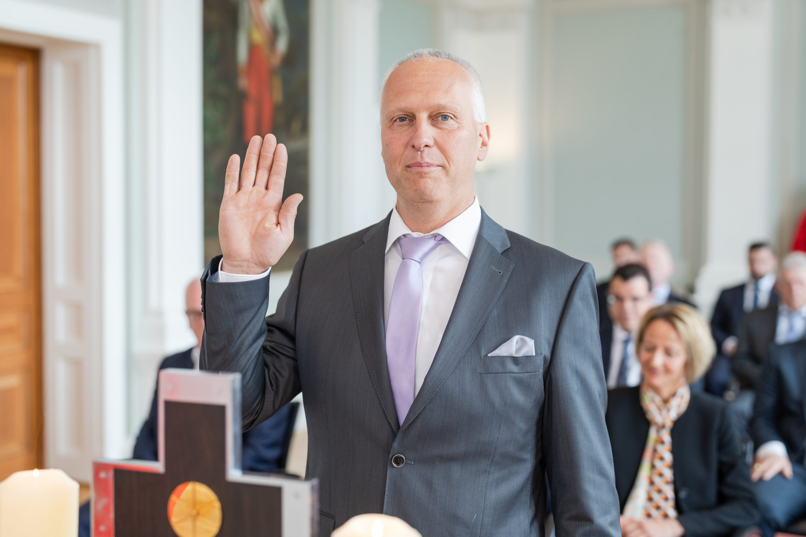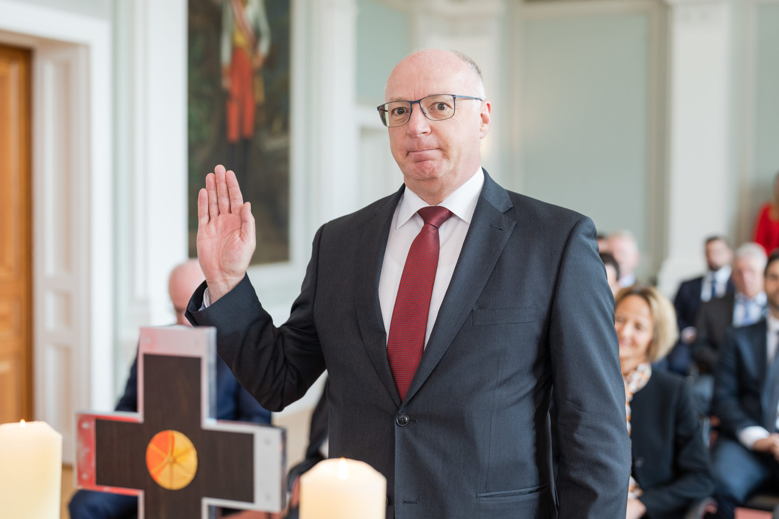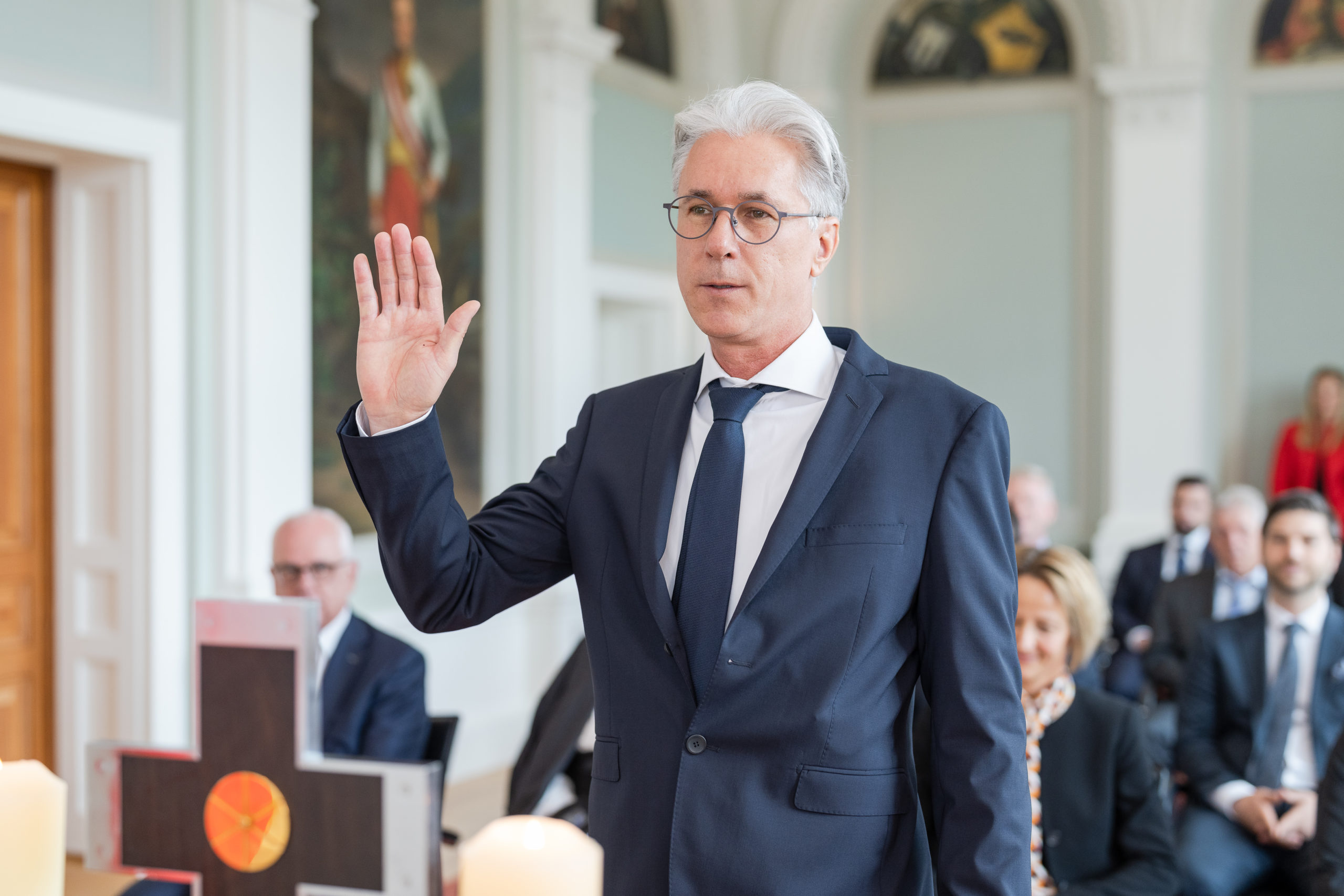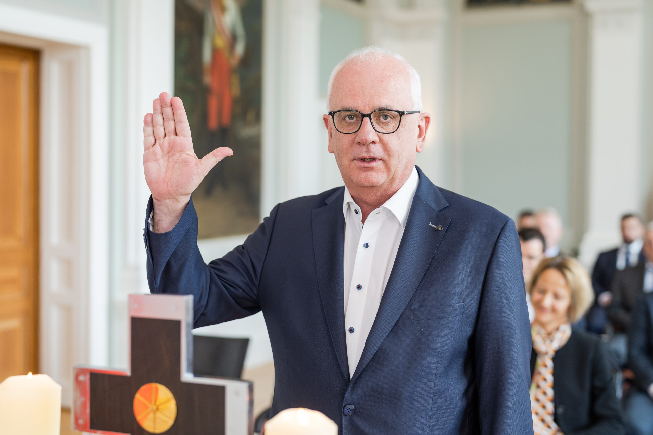 Regierungschef Daniel Risch vereidigte am Freitag, 12. Mai 2023, die Bürgermeisterin und die Gemeindevorsteherinnen und -vorsteher sowie deren Stellvertreterinnen und Stellvertreter im Fürst Johannes Saal im Regierungsgebäude in Vaduz.