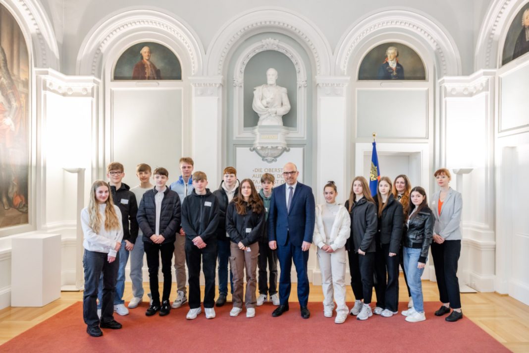 Einleitend gab Regierungschef Daniel Risch den Schülerinnen und Schülern einen Einblick in seine tägliche Arbeit. Anschliessend waren die jungen Erwachsenen an der Reihe: Sie stellten zahlreiche Fragen zu Themen, die die Jugend bewegt. Die Themen reichten vom Elektroauto, zum Wahlalter 16 bis hin zum Beitritt Liechtensteins zur EU. „Ich schätze den direkten Austausch mit Jugendlichen und freue mich stets über die politische Beteiligung von jungen Menschen in Liechtenstein“, sagte Daniel Risch. Zum Abschluss konnten die Schülerinnen und Schüler, darunter auch drei Schülerinnen aus der Ukraine, einen Blick ins Büro des Regierungschefs werfen.