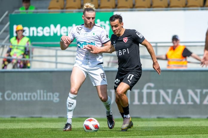Der FC Wil gewinnt das Heimspiel am 20.5.2023 mit 2:0. Im Bild Dobras (FCV, r.) im Zweikampf. Foto: Jürgen Posch