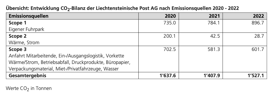 Seit 2020 arbeitet die Liechtensteinische Post mit der Firma ClimatePartner zusammen und erstellt jährlich eine Klimabilanz, welche den «Carbon Footprint» des Unternehmens berechnet. Nachdem im Jahr 2021 ein Rückgang des CO2-Werts feststellbar war, nahm dieser für das Jahr 2022 leicht zu und liegt bei 1’527.1 t CO2 für das gesamte Unternehmen. Der Grund für den Anstieg liegt im hohen, COVID-19 bedingten Homeoffice-Anteil im Vorjahr, was den Wert für die Anfahrt der Mitarbeitenden reduzierte (Scope 3). Ebenso wurden vermehrt Zusatzfahrten durch den eigenen Fuhrpark ausgeführt (Scope 1), welche aufgrund des Anstiegs der Paketmengen nötig waren.