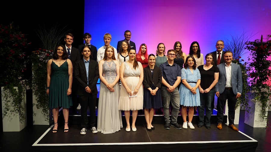 Die Lehrabsolventinnen und -Absolventen der Wirtschaftskammer mit der Note 5,3 und besser bei der Abschslussfeier am Donnerstag in Vaduz, zusammen mit Regierungsrätin Dominique Hasler, Martin Meyer, Präsident der Wirtschaftskammer und Werner Kranz, Leiter für Berufsbildung und Berufsberatung.
