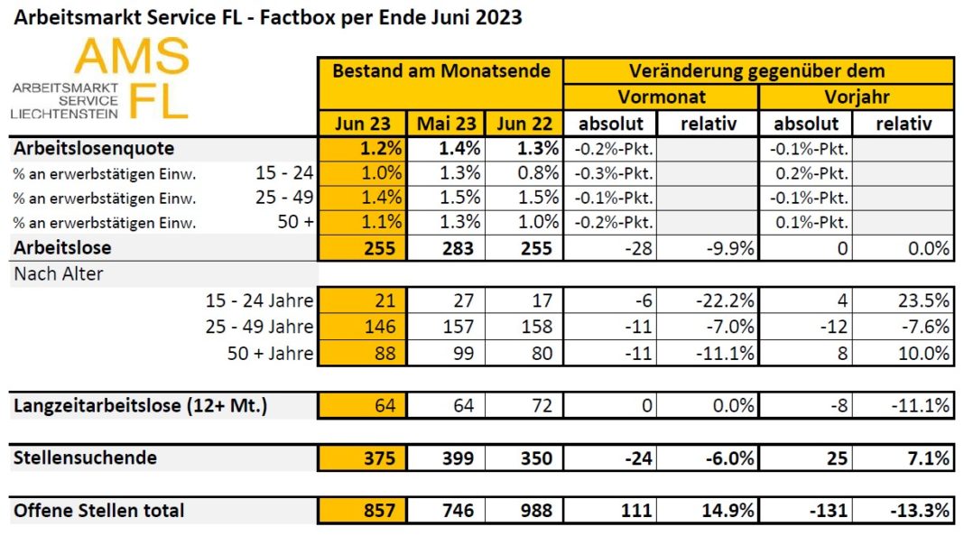 Beim Arbeitsmarkt Service Liechtenstein (AMS FL) waren Ende Juni 255 Arbeitslose gemeldet, 28 Personen weniger als im Vormonat. Die Arbeitslosenquote verringerte sich im Juni 2023 auf 1,2 Prozent gegenüber dem Vormonat. Die Arbeitslosenquote sank gegenüber dem Vorjahresmonat um 0,1 Prozentpunkte.