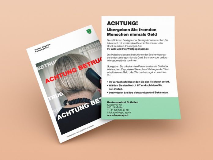 Haushalte im Kanton St.Gallen, in denen Bewohnerinnen und Bewohner leben, welche 60 Jahre alt oder älter sind, werden aktuell mit einem Brief über die zunehmenden Schockanrufe informiert. Die Kantonspolizei St.Gallen warnt vor möglichen Betrug-Szenarien.