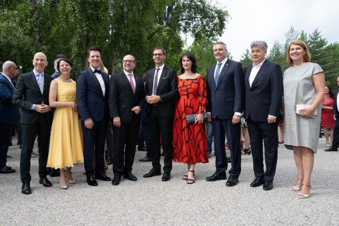 19.07.2023; Bregenz; Erffnung der Bregenzer Festspiele mit Regierungsrat Manuel Frick. Von links: Minister Martin Kocher und Gattin Natalie, Regierungsrat Manuel Frick, Alexander Schallenberg, Landeshauptmann Markus Wallner mit Gattin Sonja, Bundeskanzler Karl Nehammer, Vizekanzler Werner Kogler und Sabine Jungwirth (Foto: IKR/Michael Zanghellini)