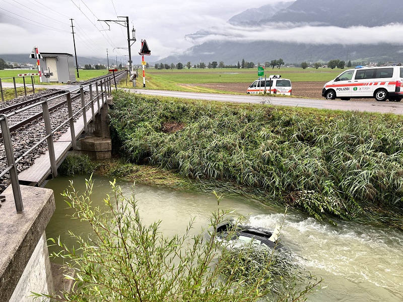 Das Auto trieb anschliessend im Wasser davon und konnte in der Dunkelheit und aufgrund des trüben Wassers vorerst nicht mehr aufgefunden werden. Bei einer erneuten Suche im Verlauf vom Dienstagmorgen konnte das Auto schliesslich unterhalb der Bahnbrücke aufgefunden werden.