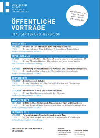 Das Spital Altstätten lädt bis Ende Jahr zu insgesamt sieben öffentlichen Vorträgen ein. Die Vorträge finden jeweils dienstags um 19 Uhr in Altstätten oder Heerbrugg statt und widmen sich orthopädischen, chirurgischen und geriatrischen Themen.