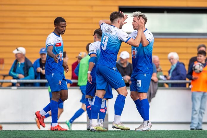 Sportpark Eschen-Mauren, Kunstrasenplatz, weil Hauptspielfeld gesperrt war, Samstag, 23.9.2023, Nr.9 der Dreifachtorschütze Maurice Wunderli, links Oliveira und rechts Bendgüz. Foto: Jürgen Posch.