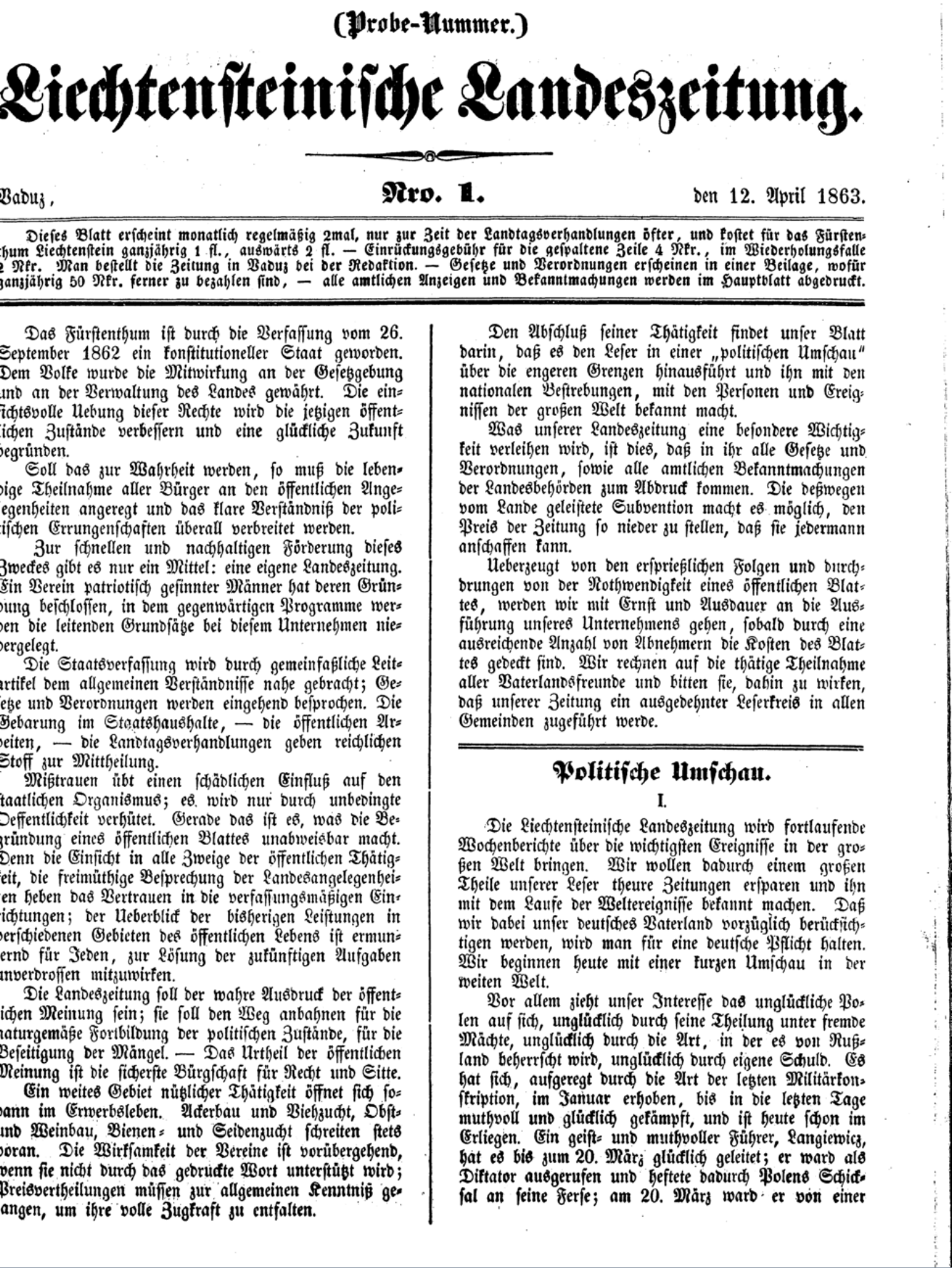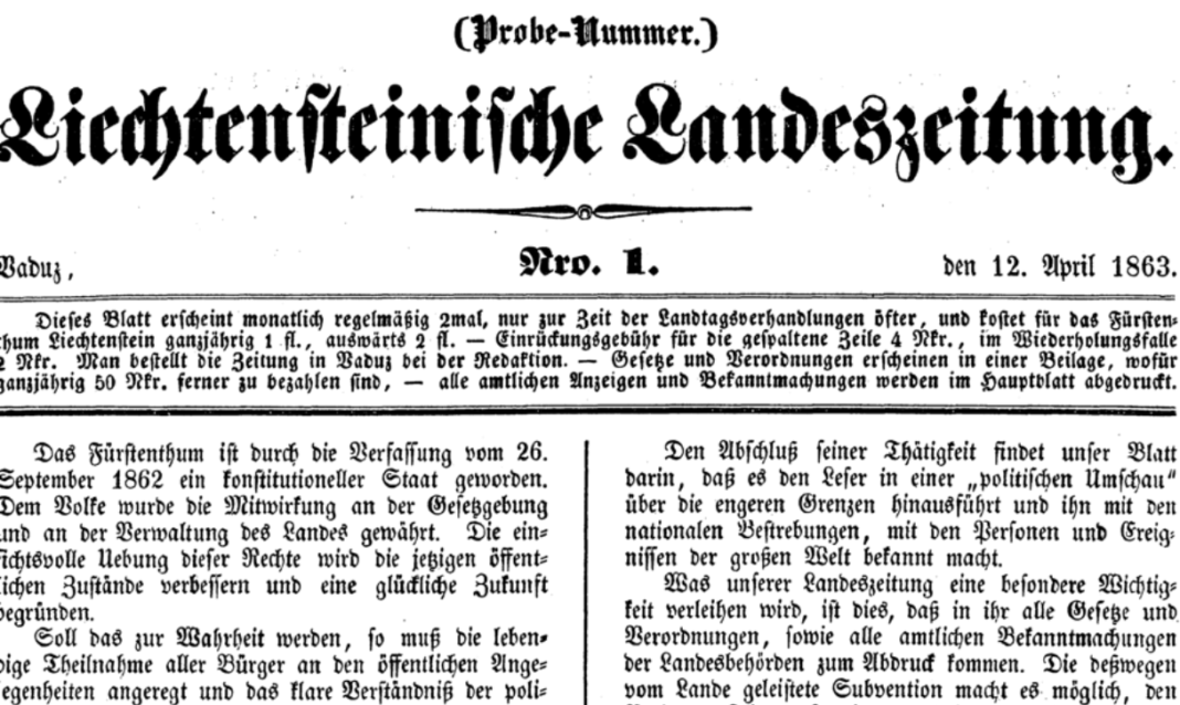 Anfang 2023 ist das Liechtensteiner Volksblatt nach 145 Jahren eingegangen. Das Volksblatt war aber nicht die erste Zeitung, die in Liechtenstein erschien. Schon vor 160 Jahren gab es die Liechtensteinische Landeszeitung, die fünf Jahre lang herausgegeben wurde. Erst fünf Jahre später wurde der nächste Versuch unternommen – mit der Liechtensteinischen Wochenzeitung, die von 1873 bis 1877 gedruckt wurde.