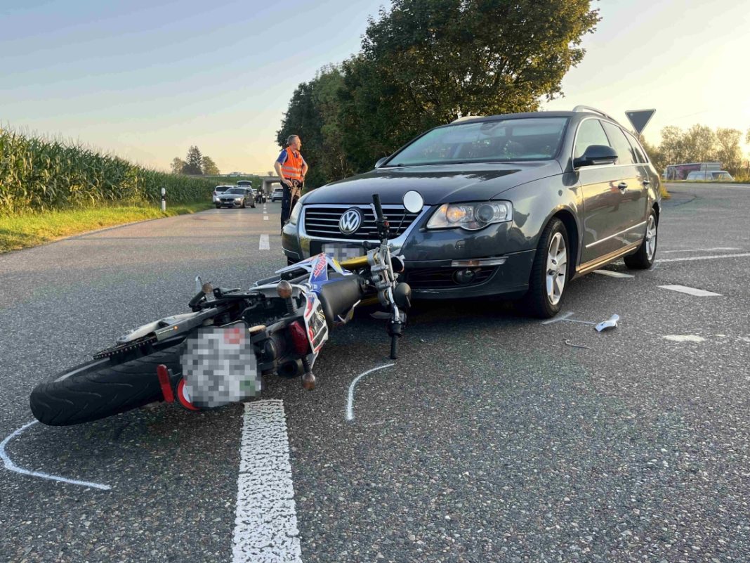 Ein 61-jähriger Mann fuhr mit seinem Auto von der alten Rheinbrücke kommend auf der Balgacherstrasse in Richtung der Verzweigung mit der Unterdorfstrasse. Dort bog er nach links Richtung Kriessern ab. Gleichzeitig fuhr die 17-Jährige auf Ihrem Motorrad von Kriessern kommend in Richtung Widnau. Dabei kam es zum Zusammenstoss der beiden Fahrzeuge. Das Auto prallte frontal gegen das Motorrad. Die Motorradfahrerin stürzte und wurde dabei unbestimmt verletzt. Der Rettungsdienst brachte sie ins Spital. An den Fahrzeugen entstand Sachschaden im Wert von rund 3’500 Franken.