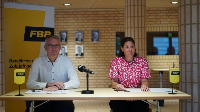 Die FBP- Abg. Bettina Petzold-Mähr und Fraktionssprecher Daniel Oehry stellten die Initiative zur Anhebung der Familienzulage vor.