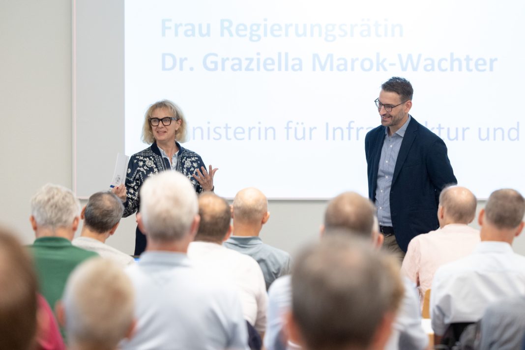 Infrastrukturministerin Graziella Marok-Wachter begrüsste die Teilenehmerinnen und Teilnehmer und würdigte die Leistung der Vermessungs- und GIS Spezialisten, die mit ihrer Tätigkeit die Grundlagen für eine zuverlässige Grundbuchvermessung, eine moderne Geodateninfrastruktur und den ÖREB-Kataster erarbeiten. Sie betonte auch die Wichtigkeit der engen und guten Zusammenarbeit der Amtsstellen des Bundes und der Kantone aus Sicht der Landesverwaltung.