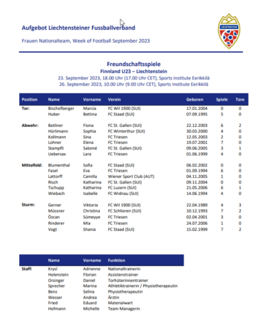 Am Samstag um 17 Uhr (MESZ) und Dienstag um 9 Uhr (MESZ) werden die zwei Aufeinandertreffen zwischen Finnlands Frauen U23 und Liechtenstein stattfinden. Dafür hat es kadermässig im Vergleich zum Auswärtsdoppel im Kosovo vier Anpassungen gegeben. Anstelle der drei USA-Legionärinnen Julia Benneckenstein, Lena Göppel und Felicia Frick, für die die Reise aufgrund der heissen Phase im Collegefootball mit je zwei Spielen pro Woche und dem Jetlag nicht ideal gelegen kommt, sowie Alina Dona werden Elena Lohner, Sofia Blumenthal, Katharina Tschupp und Sümeyye Özcan zu Spielzeit im Frauen Nationalteam kommen. „In den ersten zwei Trainingseinheiten haben die Spielerinnen einen professionellen und fokussierten Eindruck hinterlassen“, resümiert Krysl den Start der Länderspielwoche, zu der sich das Team am Montag in Ruggell traf.