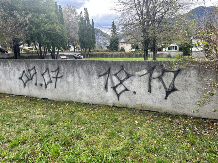 Eine unbekannte Täterschaft verunstaltete beim Alten Pfarrhaus zwischen Samstag (28.10.2023), ca. 18:00 Uhr und Sonntag (29.10.2023), ca. 08:00 Uhr die Aussenseite der alten Friedhofsmauer mit Farbschmierereien. Weitere Schmierereien wurden beim Jugendtreff „Scharmotz“ festgestellt.