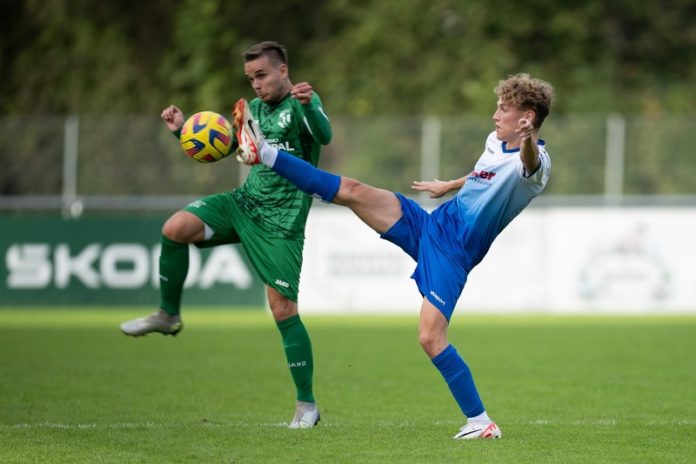 Sportpark Eschen-Mauren, SO, 8.10.2023. Derby USV II gegen FC Ruggell, 0:4 (0:1). Im Bild links der Ruggeller Captain Kollmann gegen Kling. Foto: Michael Zanghellini.