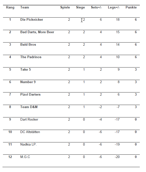 Noch ist die Tabelle wenig aussagekräftig, aber schon die ersten beiden Runden brachten die ein oder andere kleine Überraschung mit sich. So mussten beispielsweise die Sieger der beiden ersten Austragungen – „Number 9“ Saison 21/22 und „Team D&M“ Saison 22/23 – bereits ihre erste Niederlage einstecken.