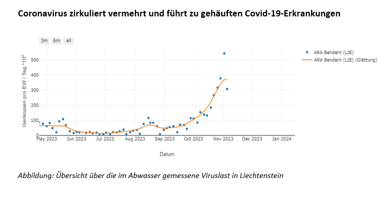 Die regelmässig seit Anfang der Pandemie durchgeführten Untersuchungen des Abwassers des Fürstentums Liechtenstein zeigen aktuell einen starken Anstieg der Indikatoren für zirkulierende SARS-CoV-2-Viren, was auf eine Zunahme von Erkrankungen schliessen lässt.