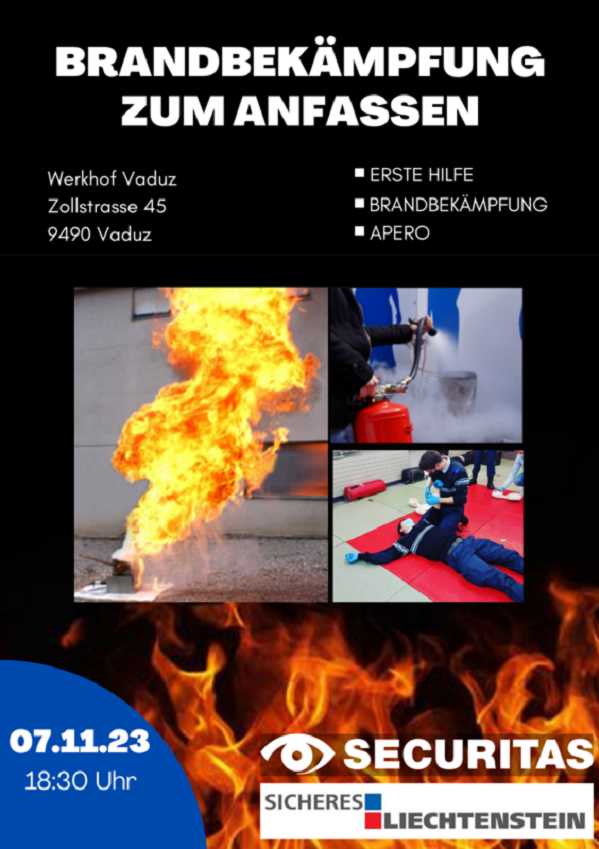 Lernen Sie wertvolle Tipps und Tricks im Umgang mit der Brandgefahr zu Hause. Unsere Veranstaltung wird zusammen mit Securitas (Liechtenstein) AG und der Ausbildungsabteilung SBIS AG durchgeführt und bietet Ihnen wichtige Erkenntnisse und Praxisübungen, um Gefahren zu erkennen und bei Brandgefahr angemessen zu reagieren. Eigenschutz, Verhalten und Umgang mit Löschgeräten spielen im Ernstfall eine grosse Rolle. Was nützen Löschgeräte, wenn man nicht richtig weiss, wie sie eingesetzt werden?