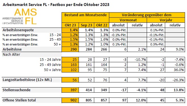 Vaduz (ots) – Beim Arbeitsmarkt Service Liechtenstein (AMS FL) waren Ende Oktober 290 Arbeitslose gemeldet, 6 Personen mehr als im Vormonat. Die Arbeitslosenquote bleibt im Oktober 2023 mit 1,4 % unverändert gegenüber dem Vormonat. Gegenüber dem Vorjahresmonat stieg die Arbeitslosigkeit um 24 Personen. Die Arbeitslosenquote erhöhte sich um 0,1 Prozentpunkte gegenüber dem Vorjahresmonat.