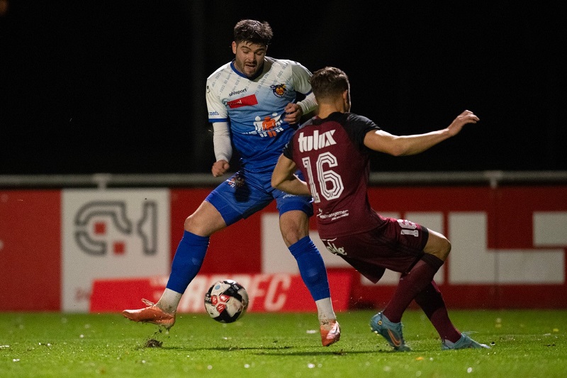 Torschütze Maurice Wunderli gegen Tuggens Innenverteidiger Herlea. Foto: Michael Zanghellini.