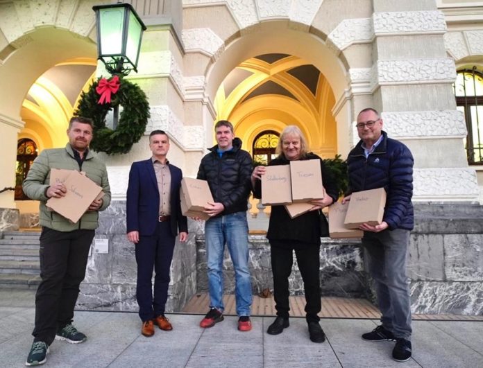 Abgabe der Unterschriften bei der Regierung. Im Bild von links Simon Schächle, Peter Sele von der Regierungskanzlei, Thomas Rehak, Herbert Elkuch und Pascal Ospelt vom DpL-Vorstand.