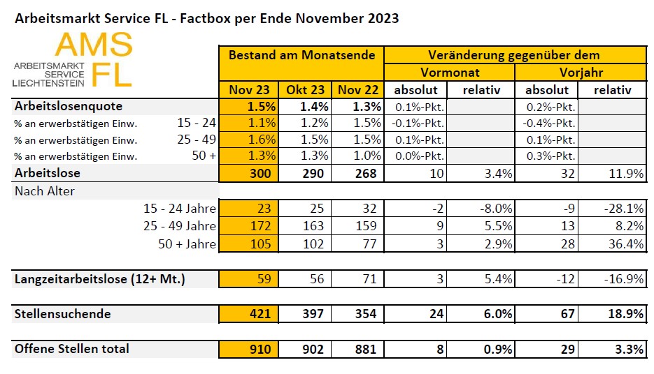 Vaduz (ots) – Beim Arbeitsmarkt Service Liechtenstein (AMS FL) waren Ende November 300 Arbeitslose gemeldet, 10 Personen mehr als im Vormonat. Die Arbeitslosenquote erhöhte sich damit von 1.4 % im Oktober auf 1.5 % im Berichtsmonat. Gegenüber dem Vorjahresmonat erhöhte sich die Arbeitslosigkeit um 32 Personen. Die Arbeitslosenquote erhöhte sich um 0,2 Prozentpunkte gegenüber dem Vorjahresmonat.