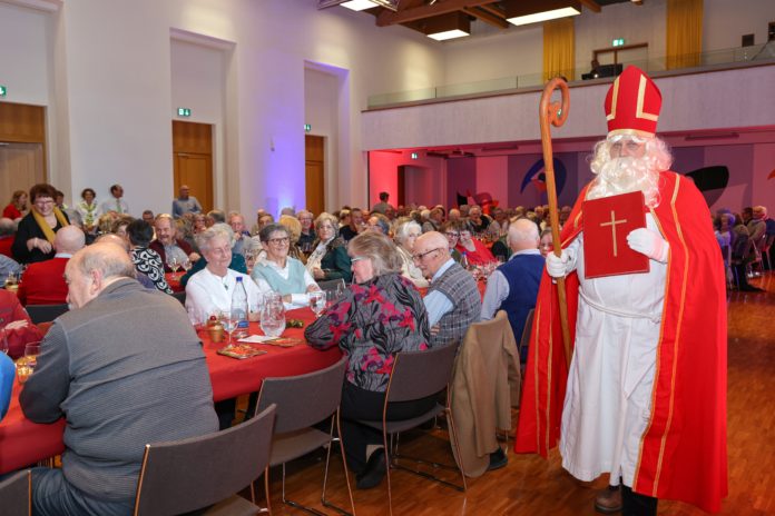 Den Höhepunkt bildete schliesslich der Besuch des Nikolaus, der die Anwesenden mit einer besinnlichen Rede begeisterte, die viel Applaus erntete. Anschliessend stattete er gemeinsam mit dem Krampus allen Tischen persönlich einen Besuch ab und verteilte kleine Geschenke an die Gäste. Abgerundet wurde die Feier schliesslich mit Weihnachtsliedern, welche die Seniorinnen und Senioren gemeinsam anstimmten, und deren Melodien sie hoffentlich noch bis spät in den Abend begleitet haben.