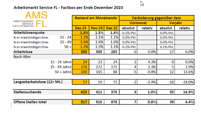 Beim Arbeitsmarkt Service Liechtenstein (AMS FL) waren Ende Dezember 300 Personen als arbeitslos gemeldet.