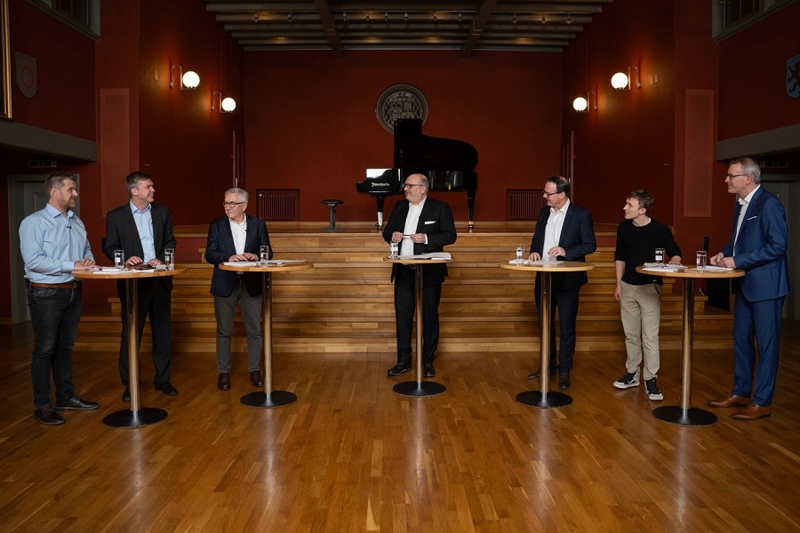 29.01.2024; Vaduz; Diskussionsveranstaltung: «Bestellung der Regierung» mit Simon Schächle, Thomas Rehak und Erich Hasler , Vertreter Initiativkomitee. Moderator Peter Beck, Thomas Zwiefelhofer, Vertreter Vaterländische Union, Valentin Ritter, Vertreter Freie Liste und Daniel Oehry, Vertreter Fortschrittliche Bürgerpartei. (Michael Zanghellini)