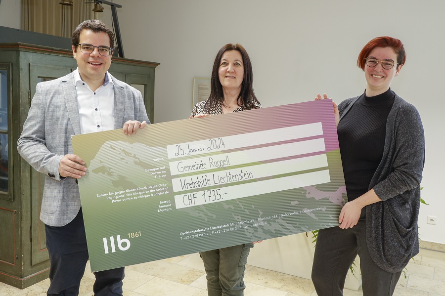 Vorsteher Christian Öhri und Gemeindesekretärin Tatjana Büchel übergaben am Donnerstag, 25. Januar im Rathaus einen Check von CHF 1‘735 an Marion Leal von der Krebshilfe Liechtenstein. Der Betrag stammt aus dem Verkauf von Adventskränzen anlässlich des letztjährigen Ruggeller Adventsmarktes am 2. Dezember 2023.