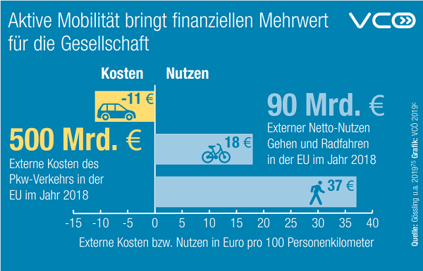 Möglichst viele Wege zu Fuss, per Fahrrad oder per ÖV (mit aktiven Wegen an Quelle und Ziel) zurücklegen, senkt die Krankheitskosten und reduziert die Verkehrsbelastung, vor allem verursacht durch die vielen Autofahrten. Etwa ein Drittel der Autofahrten sind bis drei (3) Kilometer kurz. Die persönlichen Vorteile aktiver Mobilität sind bessere Fitness und Gesundheit, also erhöhte Lebensqualität. Zudem bewirkt aktive Mobilität weniger krank machende Belastung der Umwelt, weniger Absenztage für die Wirtschaft und dank weniger Bedarf an medizinischen Dienstleistungen tiefere Krankheitskosten für die Gesellschaft.