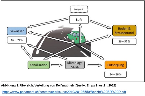 Mit dem Bericht vom 23.8.2023 hat der Schweizer Bundesrat das Postulat aus dem Nationalrat «Reifenabrieb als grösste Quelle von Mikroplastik. Massnahmen zur Verminderung» beantwortet. Die wichtigsten Ergebnisse sind: Schätzungen zufolge werden in der Schweiz jährlich zwischen 13’500 und 21’200 Tonnen Reifenabrieb produziert. Ungefähr ein Viertel davon kann durch Strassenreinigung und Abwasserbehandlung zurückgehalten und der Entsorgung zugeführt werden. Der Grossteil (≈3/4) gelangt in die Umwelt. Internationale Studien gehen davon aus, dass Reifenabrieb je nach Land und Studie für 47% (Welt) bis 93% (Schweiz) der Mikroplastikeinträge in die Umwelt verantwortlich ist.