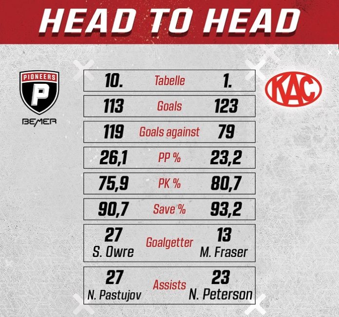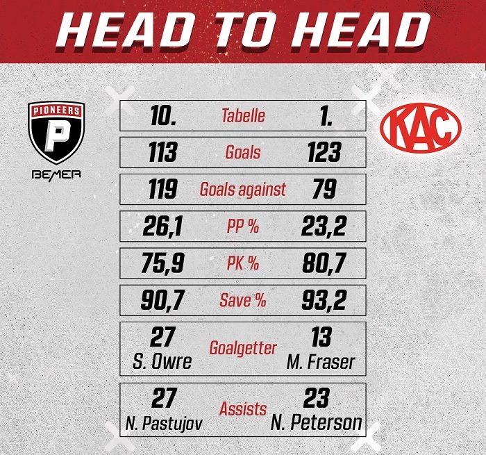 Das Freitagsspiel in Klagenfurt verspricht eine Mammutaufgabe, da der EC KAC aktuell die Tabellenspitze innehat und in den letzten 13 Spielen ununterbrochen gepunktet hat. Die Pioneers werden dementsprechend auf eine formstarke Mannschaft treffen, die darüber hinaus mit dem besten Zuschauerschnitt der Liga lautstark von ihren Fans unterstützt wird. Die Ausgangslage macht das Duell besonders spannend, da die Pioneers die Chance haben, sich gegen den Spitzenreiter zu behaupten und wichtige Punkte im Kampf ums Pre-Playoff zu sammeln.