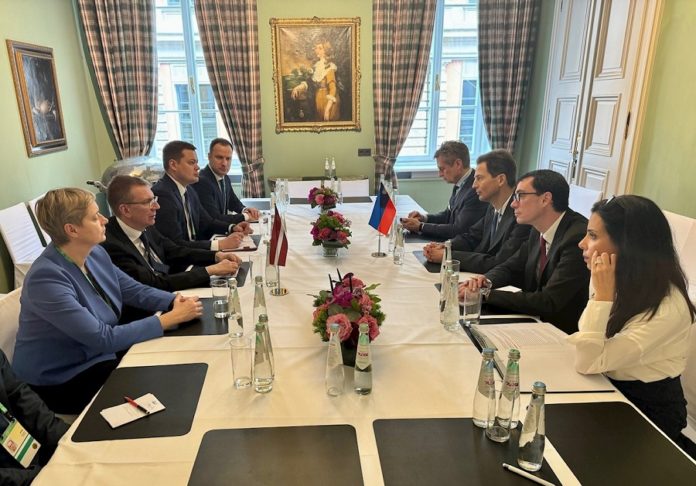 S.D. Erbprinz Alois von und zu Liechtenstein und Aussenministerin Dominique Hasler bei der Münchner Sicherheitskonferenz: Treffen der liechtensteinische Delegation mit dem lettischen Präsidenten Edgars Rincevics. Foto: IKR