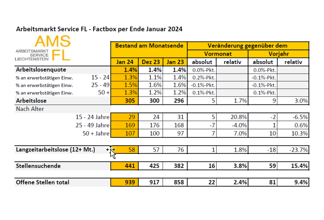Die Arbeitslosenquote bleibt im Januar 2024 mit 1.4 % unverändert gegenüber dem Vormonat. Gegenüber dem Vorjahresmonat erhöhte sich die Arbeitslosigkeit um 9 Personen. Die Arbeitslosenquote bleibt zum Vorjahresmonat ebenfalls unverändert.