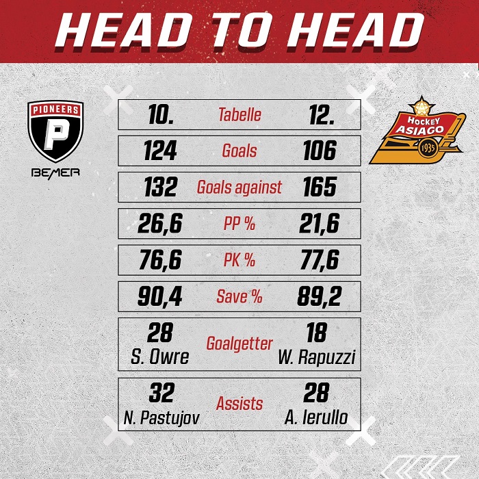 Das Heimspiel gegen Asiago bietet den Pioneers eine hervorragende Gelegenheit, einen großen Schritt in Richtung Qualifikation für die Pre-Playoffs zu machen. Asiago befindet sich derzeit auf dem vorletzten Tabellenplatz und zeigte zuletzt eine schwächere Form. Die Pioneers werden alles daransetzen, ihre Heimstärke zu nutzen und mit einem Sieg gegen Asiago wichtige Punkte einzufahren.