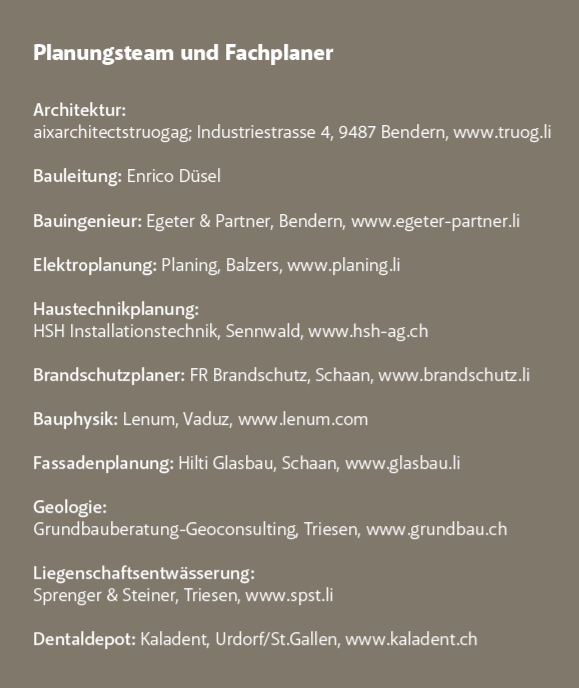 Das Fazit des Architekten fällt entsprechend zufrieden aus. «Trotz hoher planerischer und technischer Komplexität vermittelt das Gebäude einen Sinn von Leichtigkeit und Freundlichkeit. Wir stellen jetzt, nach zwei Jahren Bauphase, zufrieden fest, dass wir alle gemeinsam als Team etwas Grosses geleistet haben, auf das wir stolz sein dürfen. Stolz bin ich persönlich auch, dass es uns allen gelungen ist, das Ziel auf gesunde Art und Weise und ohne Streitigkeiten zu erreichen. Das Gebäude gibt nun einen starken Impuls am westlichen Ortseingang von Schaan», sagt Johannes Götz, dessen Dank allen Beteiligten gilt. «Die Bauherrschaft und das Planungsteam haben sich sehr gut verstanden, die Unternehmer grossartig mit uns harmoniert, die Handwerker Unglaubliches geleistet. Ausserdem danke ich den Behörden herzlich für die unkomplizierte Zusammenarbeit und den Nachbarn für ihre Rücksicht und Geduld.»