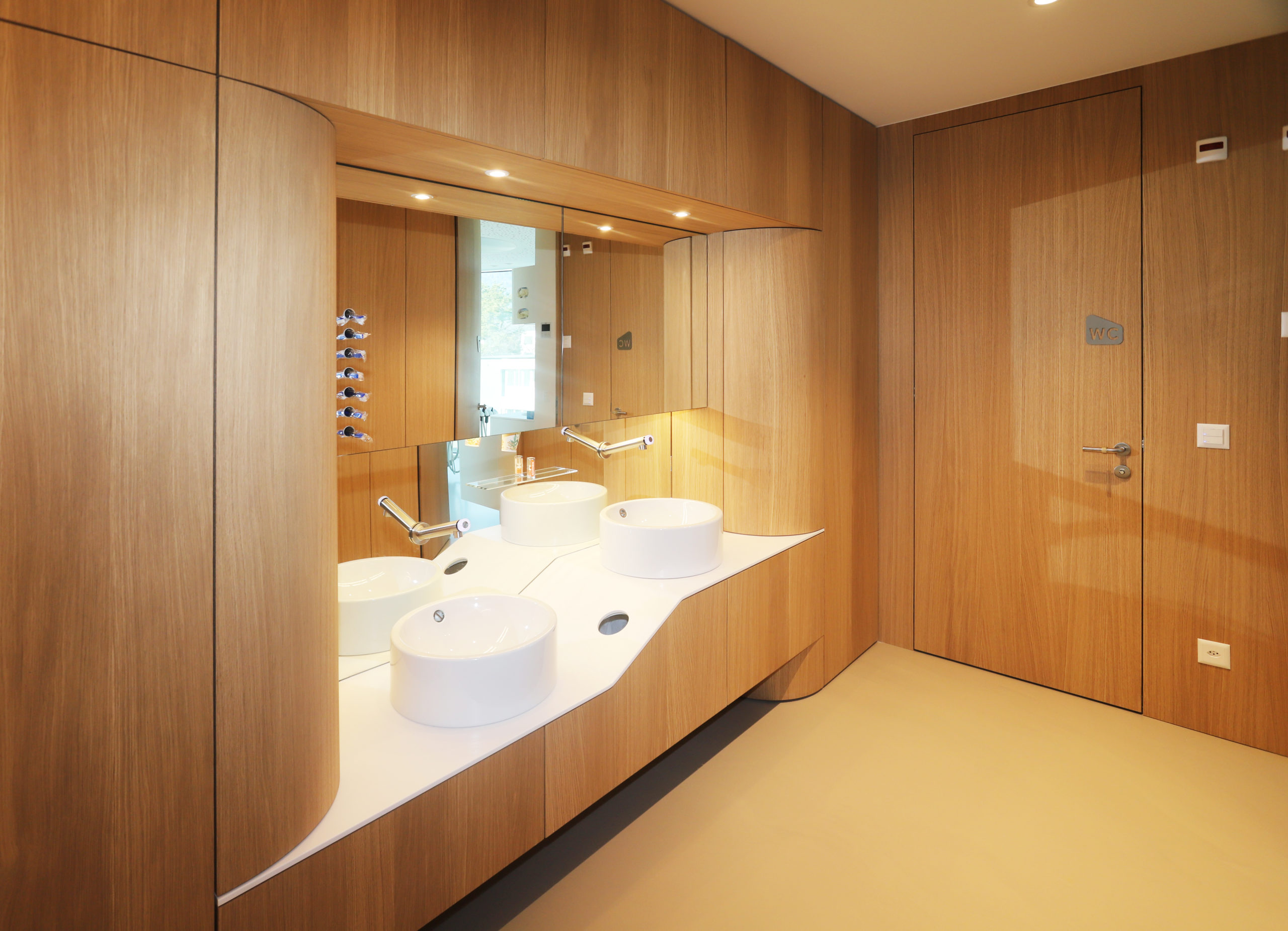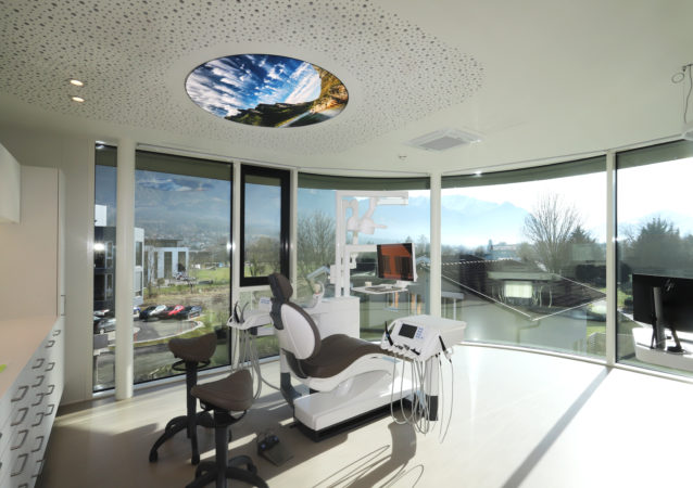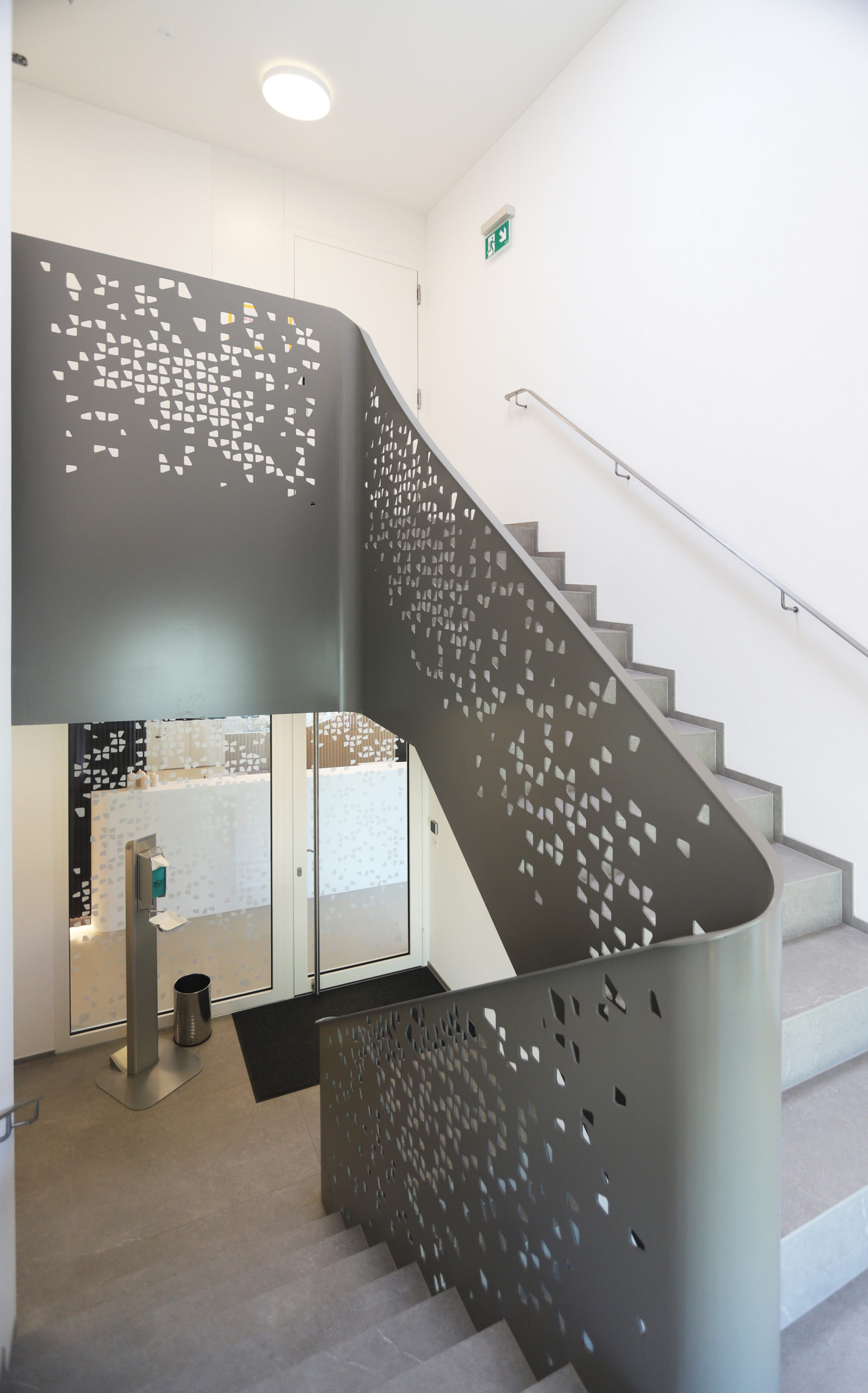 Der grosse Einsatz aller Beteiligten war nicht nur erfolgreich, sondern auch nötig, wie das fertige Gebäude erahnen lässt. «Wir hatten in der Tat eine Reihe von Herausforderungen zu bewältigen. Das fing schon damit an, dass wir das Grundstück voll ausgenutzt haben, was eine aufwendige Baustellensicherung nach sich zog. Auch sonst ergaben sich bereits zu Anfang einige technische Herausforderungen im Baugrund in Zusammenhang mit der Fundation und den Sammelschächten», sagt Johannes Götz. Als das Gebäude dann in die Höhe wuchs, wurden die Herausforderungen nicht kleiner oder weniger. «Die Rundungen und die Glasfassade, die gleichzeitig mit An- und Ausblick sowie thermischen Eigenschaften und Sonnenschutz überzeugen sollte, verlangten viel fachliches Können von Planern und Handwerkern, das überhängende Vordach war insbesondere beim Gerüstbau eine Hürde und das maximal reduzierte Erdgeschoss wurde zu einem Nadelöhr beim Planen und Realisieren der Haustechnik, die in einer Zahnarztpraxis selbstverständlich noch viel umfangreicher ist als in anderen Gebäuden. Umso mehr freut es mich, dass wir ein klares und aufgeräumtes Ergebnis erzielen konnten.» Ein Ergebnis, das aus einer Praxis mit drei Prophylaxeräumen und vier Behandlungszimmern, Empfang und Backoffice sowie Räumen für das Röntgen und die Sterilisierung der Dentalwerkzeuge auf einer Etage besteht. Von dort führt eine interne Treppe in das Geschoss, in dem sich das Zahntechniklabor befindet sowie Umkleide, Lager, Büro und Pausenraum für die Mitarbeitenden der Praxis. «Zusammenfassend lässt sich sagen: Im oberen Geschoss stehen die Patienten im Zentrum, im unteren das Team», sagt Johannes Götz. Ganz oben im Gebäude befindet sich zudem eine vermietete Penthousewohnung, die akustisch durch einen speziellen Deckenaufbau bestmöglich vom Praxisbetrieb abgetrennt ist.