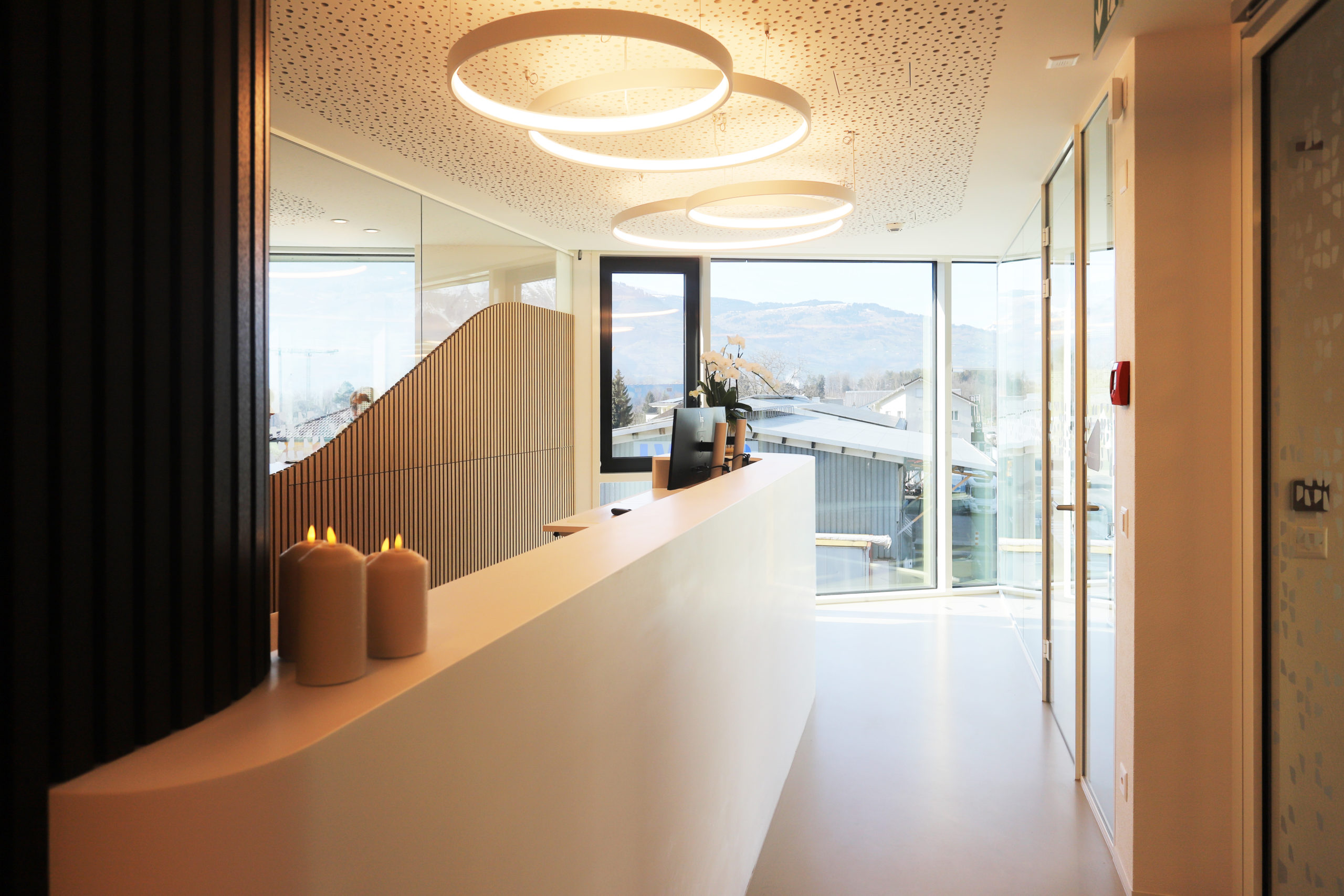 Johannes Götz konkretisiert die Überlegungen, die er sich zusammen mit seinem Planungsteam vor dem Baustart im Februar 2022 gemacht hat, wie folgt: «Wir wollten eine elegante und optisch hochwertige Erscheinung mit optimaler Funktionalität und bestmöglicher technischer Ausstattung kombinieren.» Daneben stand für ihn und die Bauherrschaft aber auch die Kundenfreundlichkeit ganz oben auf der Prioritätenliste. «Ein Beispiel dafür ist die Anordnung und Umsetzung der Besucherparkplätze. Um den zur Verfügung stehenden Raum bestmöglich auszunutzen und die Stellplätze gleichzeitig zu überdachen, haben wir uns für ein ‹schwebendes› Gebäude entschieden. Wichtig war uns auch das grossartige Panorama, das sich beispielsweise aus dem Wartezimmer geniessen lässt, und generell eine ruhige und angenehme Atmosphäre in der Praxis.»