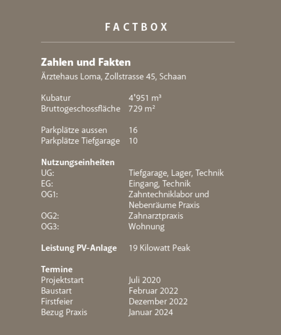 Die Planungen für das Ärztehaus Loma haben ihren Anfang im Sommer 2020 genommen. «Das Ziel war es, ein massgeschneidertes Gebäude zu schaffen, in der die Zahnarztpraxis der Bauherrschaft neue, moderne Räumlichkeiten vorfindet, und in die ein Zahntechniklabor integriert ist, das optimal mit der Praxis zusammenarbeiten, Symbiosen nutzen und interagieren kann», sagt Johannes Götz, der das Projekt zusammen mit Joe Truog, dem Geschäftsführer der «aix architects truog ag», geleitet hat. «Im Zentrum standen für uns sowohl die Atmosphäre als auch die Funktionalität. Ein Beispiel für Letzteres ist der Warenlift, der Praxis und Labor miteinander verbindet.»