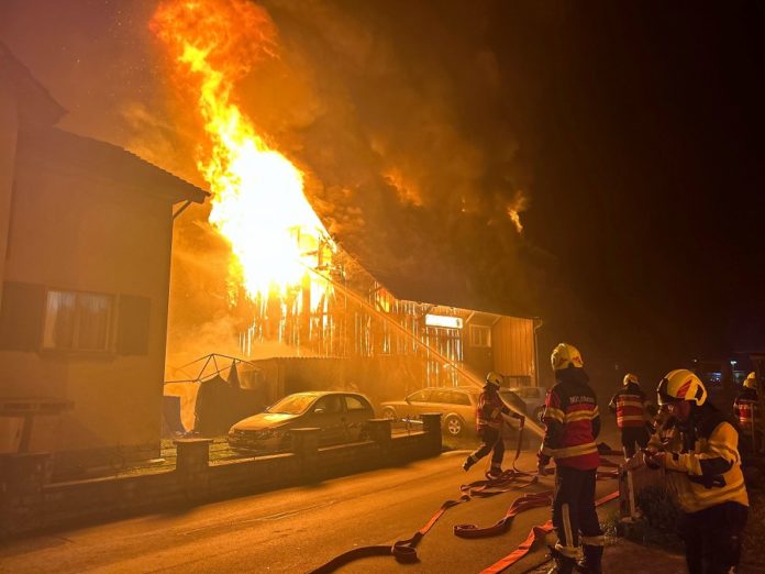 Aus bislang noch unbekannten Gründen ist das Einfamilienhaus mit angebauter Scheune in Brand geraten. Der Brand breitete sich rasch zu einem Vollbrand der ganzen Liegenschaft aus, konnte von der Feuerwehr aber mittlerweile unter Kontrolle gebracht werden. Die Löscharbeiten dauern zum Zeitpunkt der Berichterstattung noch an.