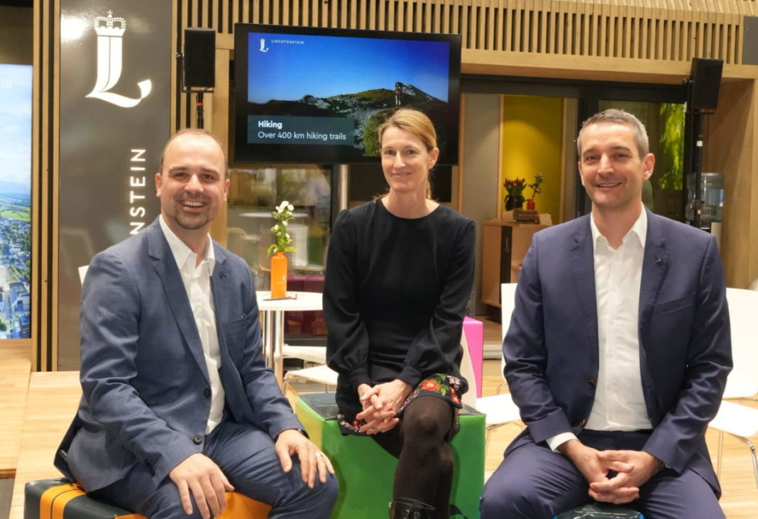 Der aufsehenerregende Messestand von Liechtenstein Marketing dient als ideale Plattform für die Vernetzung mit der Reisebranche. Beim Liechtenstein-Empfang spricht neben Mathias Ulrich, Geschäftsführer von Liechtenstein Marketing, auch Isabel Frommelt-Gottschald, Liechtensteiner Botschafterin in Berlin.