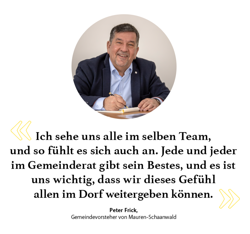 Wir sind eine Gemeinde mit vielen Nationen und erachten diese Vielfalt als eine grosse Chance. Der Gemeinderat führt dazu das Vorprojekt «Zemmaläba» weiter. Mit den erwähnten Gemeinderatsmitgliedern und weiteren Personen aus der Kommission Gesellschaft haben wir im Februar die bereits angesprochene Arbeitsgruppe bestellt. Sie bearbeitet für uns alle wichtige Themen wie Wertehaltung in der Gesellschaft, Vernetzung der Generationen und Gesellschaftsbereiche, Gesundheitsbewusstsein, Begegnung und Kulturenvielfalt, Wohlbefinden der sozialen Gesellschaft und Ressourcen. Auch diesbezüglich bin ich sehr zuversichtlich, dass wir noch in der laufenden Mandatsperiode erste Ergebnisse präsentieren werden. Ich sehe uns alle im selben Team, und so fühlt es sich auch an. Jede und jeder im Gemeinderat gibt sein Bestes, und es ist uns wichtig, dass wir dieses Gefühl allen im Dorf weitergeben können. Das Miteinander steht im Vordergrund und bringt all die Kreativität und Konstruktivität zum Vorschein. So stelle ich es mir vor, Mauren-Schaanwald weiterzubringen.